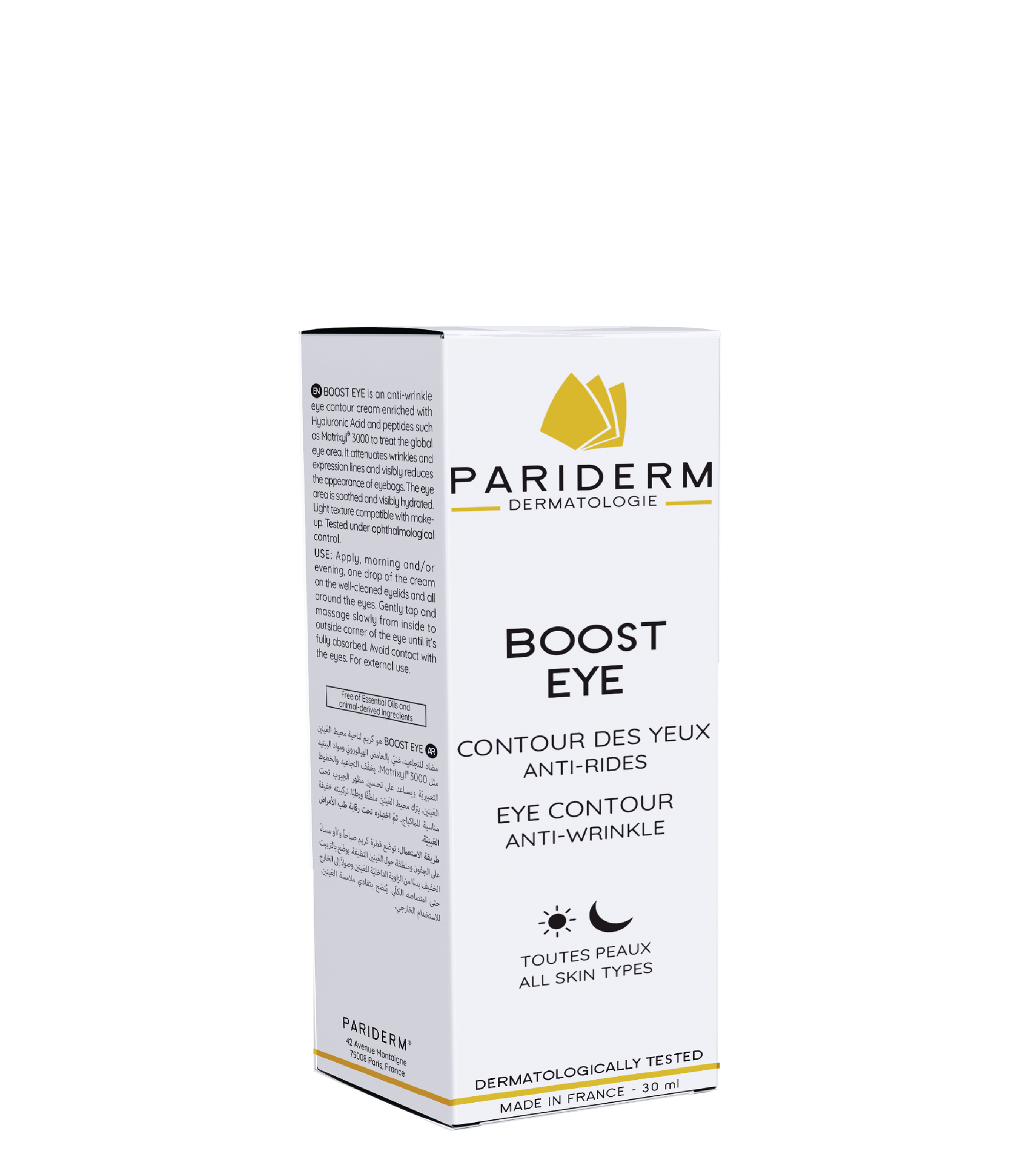 BOOST EYE is an anti-wrinkle eye contour cream enriched with Hyaluronic Acid and peptides such as Matrixyl 3000 to treat the global eye area. It attenuates wrinkles and expression lines and visibly reduces the appearance of eyebags. The eye area is soothed and visibly hydrated. Light texture compatible with make up. Tested under ophthalmological control